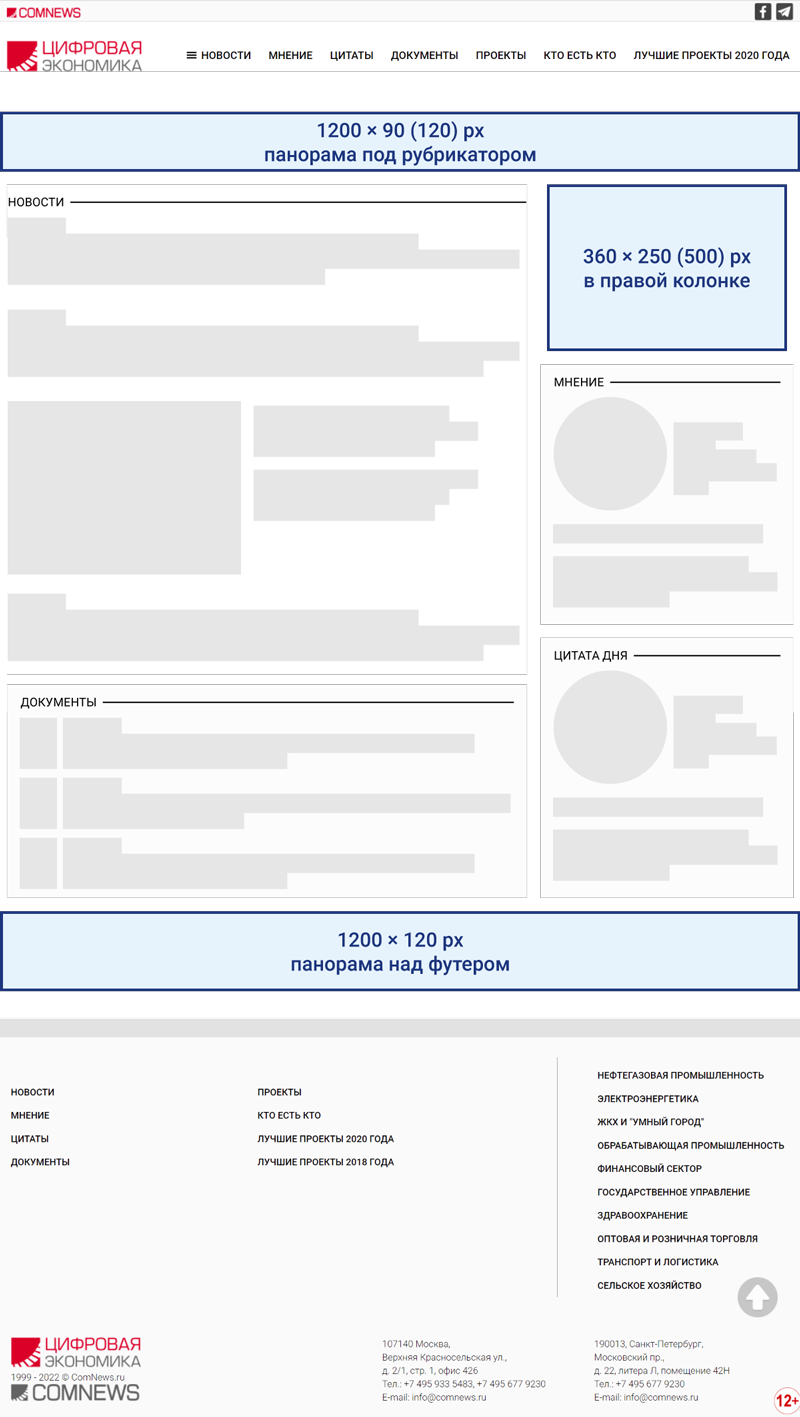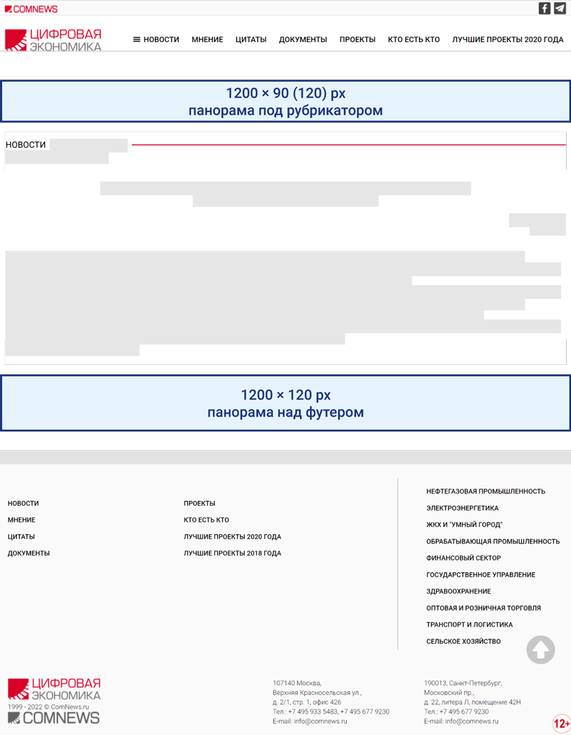 Размещение логотипа партнера с указанием на Партнерство рубрики "Цифровая экономика" Размещение до 4 информационных материалов (новостей) в месяц о цифровой трансформации и внедрении цифровых технологий в отраслях российской экономики на главной странице рубрики с последующим переходом в одну из 10 отраслевых рубрик Размещение материала в рубрике "Мнение" с анонсированием на главной странице ComNews.ru в течение пяти рабочих дней с дальнейшим переходом в архив рубрики "Мнение". В годовом контракте – 2 материала, в контракте на 6 месяцев - 1 Стоимость контракта на 12 месяцев – 280 000 руб., на 6 месяцев – 150 000 руб. Промаркированные материалы в архиве хранятся до 3 месяцев. |