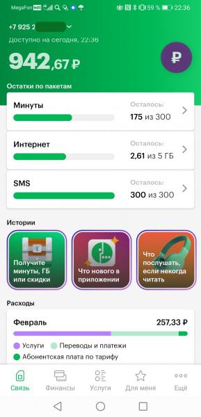 Разработчики заняли часть экрана так называемыми "сториз" (историями), предполагается, что абоненты будут черпать здесь интересную им информацию, а в качестве бонуса иногда получать любопытные персональные предложения. Информацией я измучен и без оператора, но раздел "Получите минуты, ГБ или скидки" выглядит привлекательно.