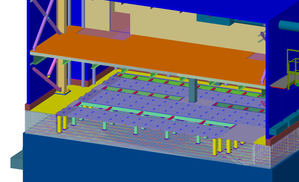 В качестве основных инструментов мы активно использовали модули "Model Studio CS Строительные решения", "Model Studio CS Кабельное хозяйство", а также "CADLib Модель и Архив". Первым кейсом проекта стала разработка конструктивных решений для фундамента роликовой печи. При решении этой задачи нам потребовалось объединить архивные чертежи, модель заказчика, модель от поставщика оборудования и результаты обследований. В процессе строительных работ на площадке были выявлены неучтенные ранее конструкции, поэтому, чтобы обеспечить их учет при дальнейшей эксплуатации, мы разработали и передали заказчику соответствующие решения.