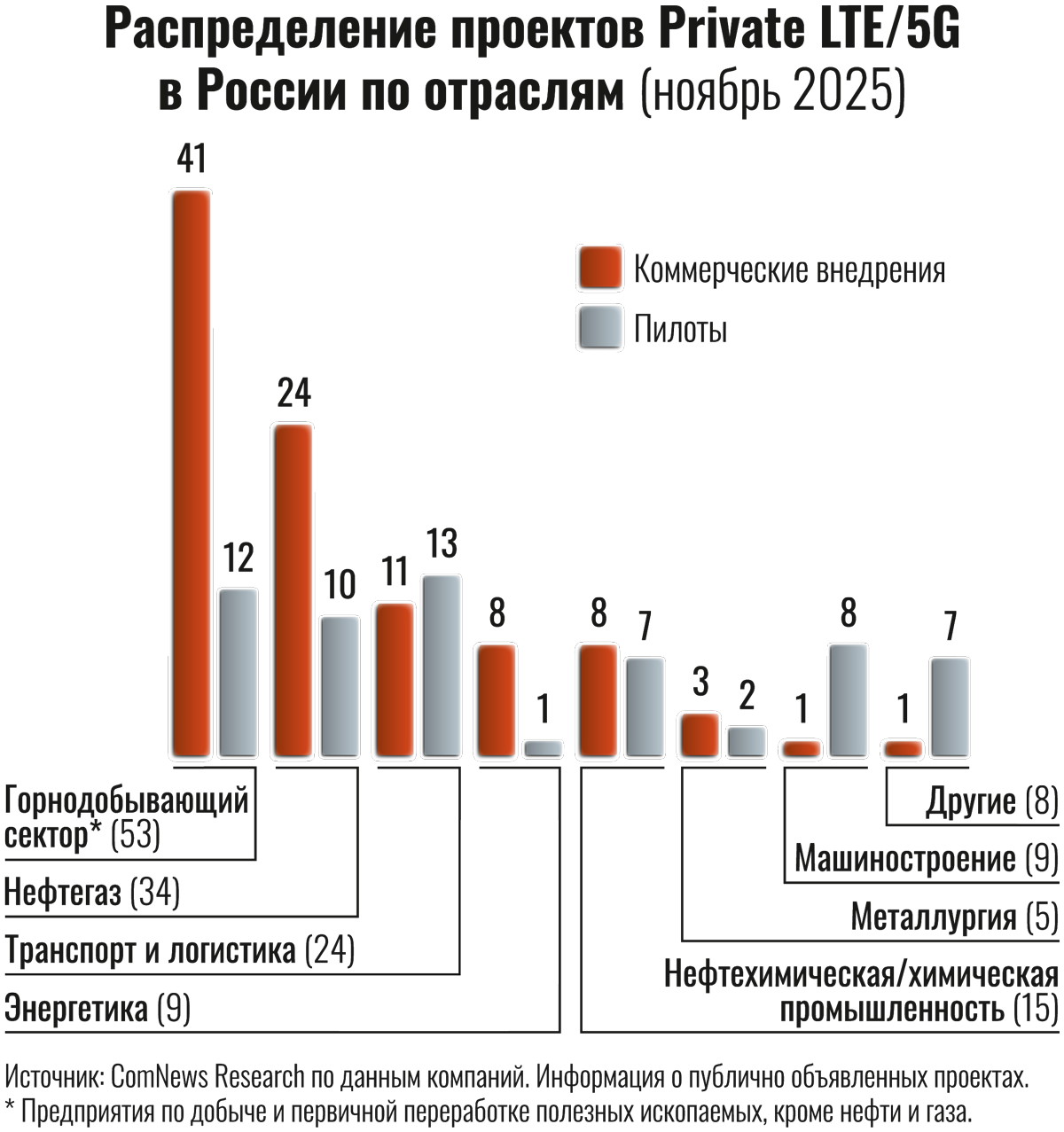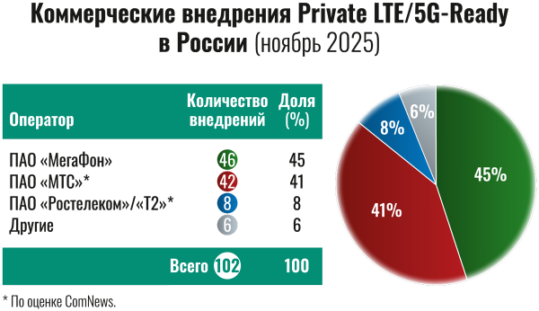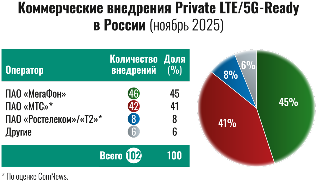 Согласно опросу ComNews, по состоянию на ноябрь 2025 года в России развернуто 102 коммерческие сети Private LTE (на карте показано 97 коммерческих сетей), и большинство из них - с участием операторов связи.