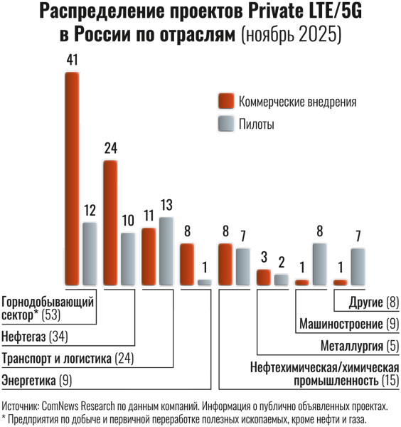 По числу проведенных пилотных проектов Private LTE/5G в России лидируют такие отрасли как: транспорт и логистика (13), горнодобывающая промышленность (12), нефтегаз (10), машиностроение (8) и химическая и нефтехимическая промышленность (7).