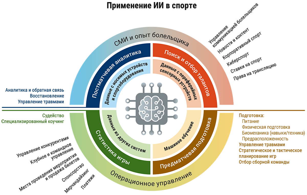 Машинное обучение и предиктивная аналитика обрабатывает огромные игровые данные, чтобы помочь тренерам находить решения, основанные на статистической информации ИИ на спортивном рынке делится на машинное обучение (ML), НЛП, компьютерное зрение и прогнозную аналитику.