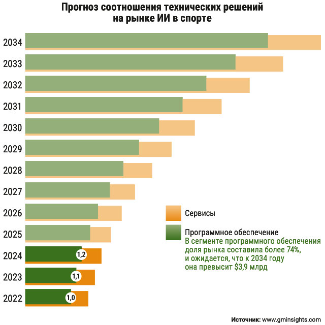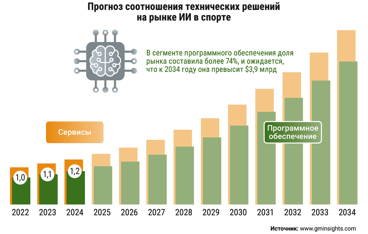 По данным исследовательского агентства Global Market Insights, объем мирового рынка ИИ в спортивной сфере в 2024 году составил $1,2 млрд и, по прогнозам, достигнет $4,7 млрд в 2034 году - рост составит 14,7% в период с 2025 по 2034 годы. Среди ИИ-технологий в 2024 году машинное обучение было ведущим технологическим сегментом, с рыночной долей 41%.