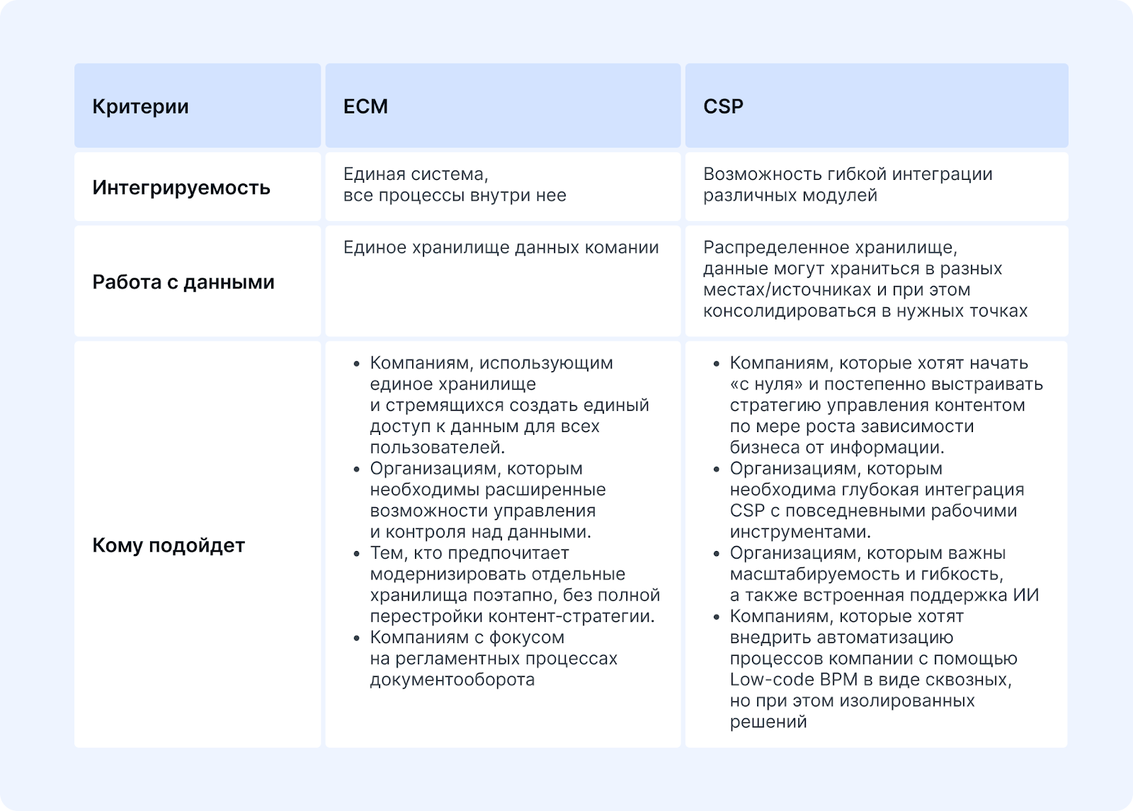Если в традиционной СЭД объектом управления является сам файл или карточка документа, то в CSP центральным элементом становится контент и контекст вокруг него: данные о контрагенте, история сделок, внутренние чек-листы, регламенты, даже смысл текста. Такие платформы помогают собирать, систематизировать, хранить и получать доступ к контенту разных отделов и филиалов в едином цифровом пространстве. Такие платформы критически важны как при росте и расширении бизнеса, так и при переходе сотрудников на удаленную работу, когда нужна возможность быстрого доступа к данным.